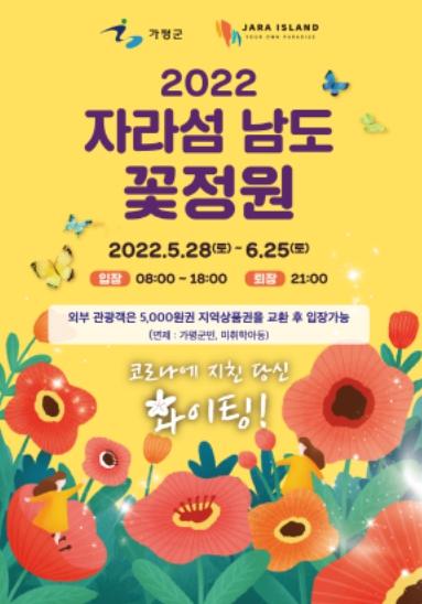 자라섬 남도의 공식개방기간은 5.28일부터 6.25일까지 이며, 입장료 5,000원은 전액 가평사랑삼품권으로 교환하여 지역경제 활성화를 위해 쓰일 예정이다.