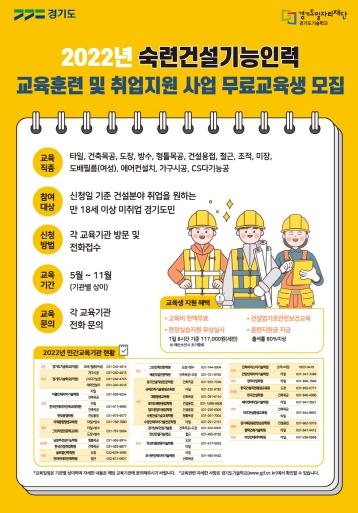 [한국뉴스타임=편집국] 경기도일자리재단이 2022년도 건설분야 교육생 1,800명을 모집해 도내 32개 교육기관을 통해 현장 맞춤형 건설기능인력 양성에 앞장선다.