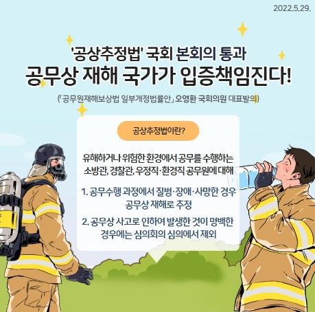 오영환 의원은 ‘공상추정법’의 국회 본회의 통과와 관련하여 “앞으로 공무원과 유족들의 입증책임의 부담을 덜고, 국가가 책임지게 된다”면서, “국민의 안전을 위해 헌신하는 공무원들을 국가가 나서서 보다 더 두텁게 보호하게 될 것”이라 설명했다.