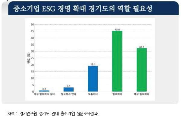 [한국뉴스타임=편집국] 경기도 중소기업의 77.1%는 기업의 사회적 책임을 강조하는 환경·사회·투명(ESG) 경영 활성화를 위해 경기도의 지원이 필요하다고 인식한다는 조사 결과가 나왔다.