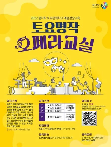 [한국뉴스타임=편집국] 재단법인 포천문화재단은 오는 4일부터 8월 25일까지 포천반월아트홀에서 어린이를 위한 ‘꿈다락 토요문화학교 예술감상교육-토요명작 오페라교실’을 운영한다.