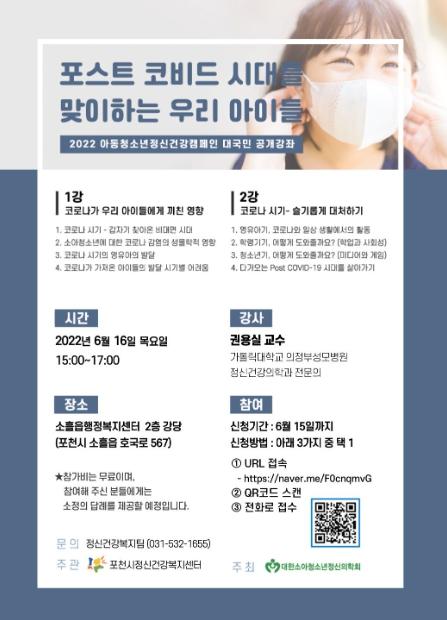 [한국뉴스타임=편집국] 포천시정신건강복지센터는 오는 16일 소흘읍 행정복지센터 2층 강당에서 ‘포스트 코비드 시대를 맞이하는 우리 아이들’이라는 주제로 2022년도 아동청소년 정신건강캠페인 대국민공개강좌를 개최한다.