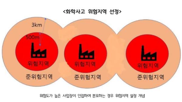 [한국뉴스타임=편집국] 대형 피해를 일으키는 화학사고에 대응하기 위해 유해화학물질 취급?보관량 등 화학사고 위해도(환경 유해 인자에 노출됨으로써 사람의 건강이나 환경이 악영향을 받게 될 개연성의 정도)가 높은 지점 반경 500m~3㎞를 ‘위험지역’으로 설정해 실내대피 관리체계 등을 구축하자는 연구 결과가 나왔다.