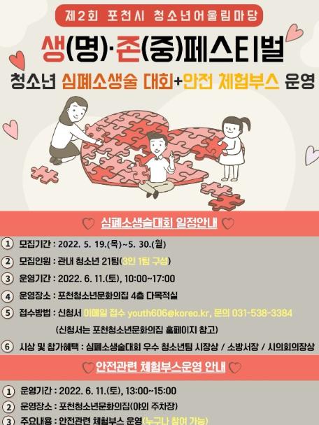 [한국뉴스타임=편집국] 포천시는 오는 11일 포천청소년문화의집에서 ‘2022년 포천시 제2회 청소년어울림마당 생명·존중 페스티벌’를 개최한다.