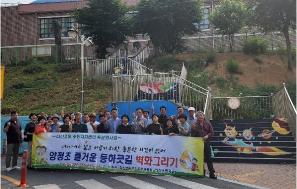 앞서 다산2동 주민자치위원회는 지난달 23일 양정초등학교 학생들의 참여하에 벽화의 일부를 완성했으며, 학생들은 쉽게 접하기 힘든 벽화 그리기 활동을 통해 성취감은 물론 소중한 학창 시절의 추억을 만들었다.