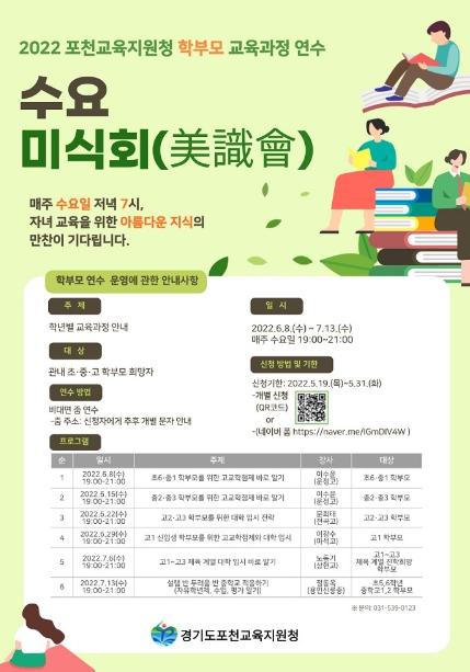 [한국뉴스타임=편집국] 포천교육지원청은 8일 오후 7시 ‘2022 교육과정 이해를 위한 학부모 연수’를 개최한다고 밝혔다. 고교학점제와 자유학년제 바로 알기 학부모 연수"수요 미식회(美識會)"는 8일부터 7월 13일까지 6주간에 걸쳐 매주 수요일 저녁마다 진행되는 학부모 대상 학년별 교육과정 안내 연수이다.