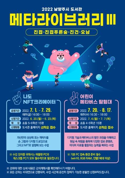 오는 7월 1일부터는 진접·진접푸른숲·진건·오남도서관 주관으로 어린이 이용자들을 대상으로 한 "어린이 메타버스 탐험대"와 "나도 NFT 크리에이터" 프로그램이 진행될 예정이다.