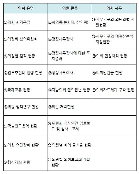 정보공개 항목은 의회 운영, 의원 활동, 의회 사무 등 3개 분야 총 23건으로 구성하였으며 지방의회 담당자들이 쉽게 이해할 수 있도록 각 항목별 법적근거와 공개방법, 공개주기, 세부공개항목 등을 구체적으로 제시하였다.