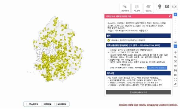 한편, 도는 기존 경기부동산포털에서 제공하고 있던 기획부동산 피해주의지역 안내 서비스의 위치 정보를 실시간 안내할 수 있도록 기능을 개선했다. 또한 ‘기획부동산 불법행위(피해) 신고센터’와 연계해 기획부동산 사기 피해자와 제보자의 신고도 접수해 주기적으로 수사기관에 수사를 의뢰할 계획이다.