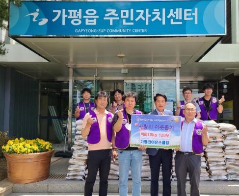 [한국뉴스타임=편집국] 가평라이온스클럽 회원 일동은 금일 14일 가평읍 행정복지센터를 방문하여 관내 저소득 계층을 위한 이웃돕기 성품 백미10kg 120포를 기탁했다.