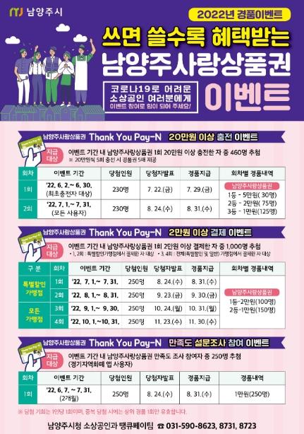 [한국뉴스타임=편집국] 남양주시는 6월 7일부터 7월 31일까지 남양주사랑상품권(Thank You Pay-N) 사용자와 가맹점을 대상으로 2022년 남양주사랑상품권의 이용현황 및 만족도 설문조사를 실시한다고 15일 밝혔다.