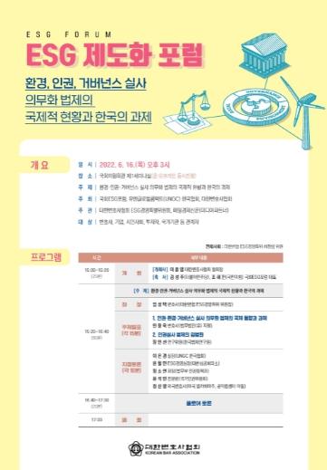 [한국뉴스타임=편집국] 국회 ESG 포럼(공동대표 : 국회의원 김성주, 국회의원 조해진)이 오는 6월 16일(목) 오후 3:00 국회의원회관 제1세미나실에서 ‘인권·환경·거버넌스 실사 의무화 법제의 국제적 현황과 한국의 과제’를 주제로 대한변호사협회, 유엔글로벌콤팩트(UNGC)와 함께 'ESG 제도화 포럼'을 개최한다. 국회 ESG 포럼은 지난해 발족한 국회의원 연구모임으로, 여·야 63인의 의원이 속해있다.