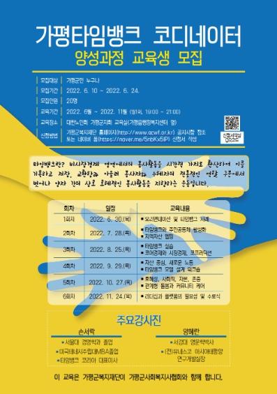 [한국뉴스타임=편집국] 가평군복지재단은 2022년 가평타임뱅크 코디네이터 양성과정 교육 참여자를 6월 24일까지 모집한다.