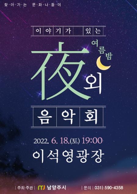 [한국뉴스타임=편집국] 남양주시는 오는 18일 이석영광장에서 도심 속 콘서트 ‘이야기가 있는 여름밤 야외음악회’를 개최한다고 밝혔다.