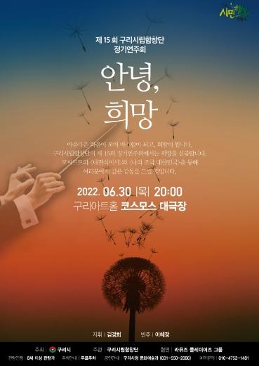 구리시립합창단(단장 차종회 부시장)의 제15회 정기연주회 '안녕, 희망'이 30일 20시부터 90분간 구리아트홀 코스모스 대극장에서 개최된다고 밝혔다.