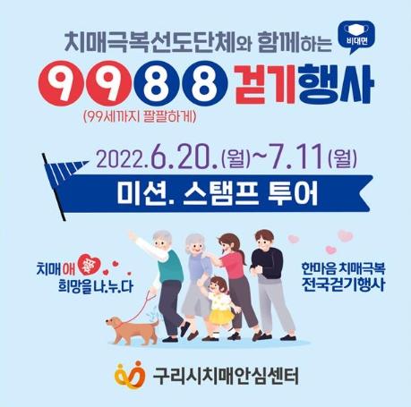 [한국뉴스타임=편집국] 구리시는 20일부터 치매 인식 개선과 치매 환자 및 가족들의 건강증진을 위한 "9988(99세까지 88하게) 걷기 스탬프 챌린지"를 개최한다.