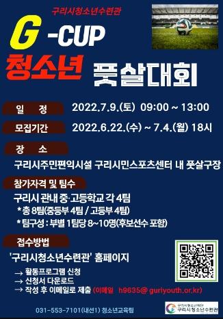 구리시청소년재단(대표이사 신재옥) 구리청소년수련관은 22일부터 7월 4일까지 구리주민편익시설 구리시민스포츠센터 내 풋살구장에서 개최하는 'G-CUP 청소년 풋살대회'의 참가자를 모집한다.