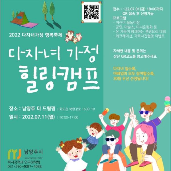 남양주시 거주 3자녀 이상의 가정은 누구나 6월 22일부터 7월 1일 18시까지 카카오톡 오픈채팅 접속을 통해 신청과 문의가 가능하며, 참여신청자 중 다자녀 순, 부모 모두 참여하는 가족 순으로 30세대가 선정될 예정이다.