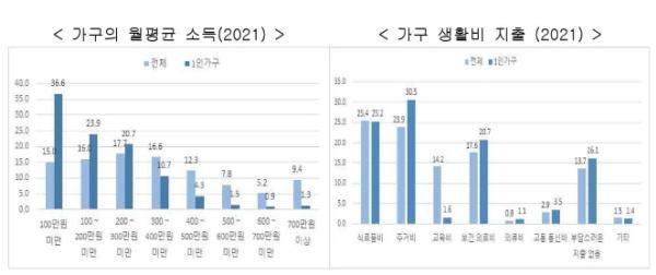 1인 가구는 가구 생활비로 주거비(30.5%), 식료품비(25.2%), 보건?의료비(20.7%) 등의 순으로 많이 지출했다. 경기도 전체 가구의 생활비 지출 비중이 식료품비(25.4%), 주거비(23.9%), 보건?의료비(17.6%) 등의 순인 것을 고려하면 1인 가구가 상대적으로 주거비와 보건?의료비 부담을 크게 느낄 것으로 분석됐다.