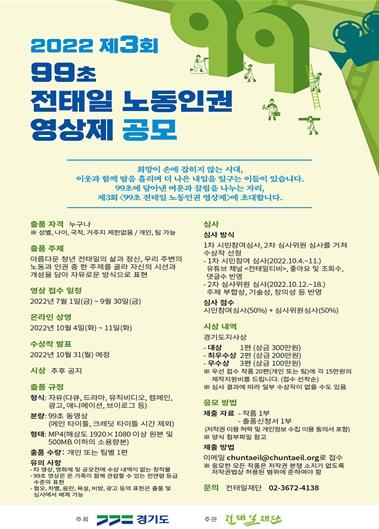 전태일, 노동, 인권에 관심 있는 사람이면 성별, 연령, 거주지 제한 없이 참여가 가능하다. ‘전태일의 삶과 정신’, ‘우리 주변의 노동과 인권’ 중 한 주제를 골라 자유로운 방식으로 99초 분량의 영상작품을 만들면 된다.
