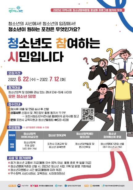 이 사업은 여성가족부에서 주관한 ‘지역사회 청소년 참여활동 활성화 공모사업’이다. 시는 ‘청소년도 참여하는 시민입니다’라는 주제로 포천시 청소년정책에 대한 다양한 의견을 수렴하기 위해 아이디어공모전과 정책 및 조례교육, 선거교육 등 청소년에게 시민으로서의 교육 기회를 제공하고, 청소년들이 민주시민 사회의 일원으로 청소년 정책을 직접 발굴한다.