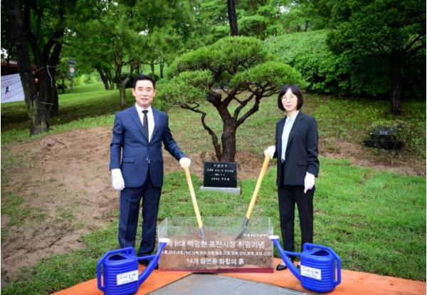 [한국뉴스타임=편집국] 포천시는 제8대 백영현 포천시장 취임을 기념하기 위해 1일 유연미 여사와 함께 군내면 청성역사공원에서 기념식수를 했다고 밝혔다.