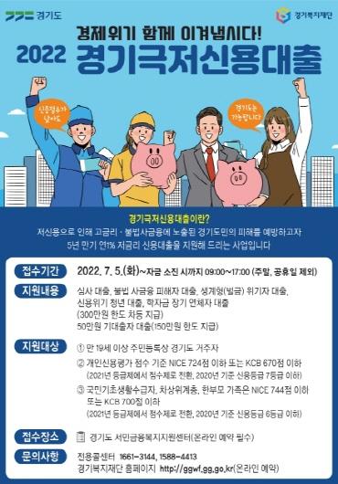 [한국뉴스타임=편집국] 경기도가 물가 상승 등 민생 경제 위기 대응의 하나로 ‘경기 극저신용대출’ 접수를 한 달 앞당겨 7월 5일부터 조기 추진하고, 접수처인 서민금융복지센터의 임시 거점센터를 2개소(수원·의정부) 증설해 총 21개소로 운영한다.