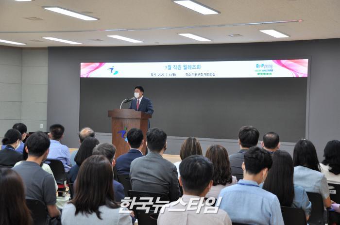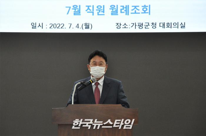 [한국뉴스타임=보도국] 4일 오전 서태원 가평군수는 군수 위임 후 첫 직원 워례조회를 개최하였다.