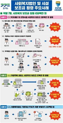구체적 사례를 살펴보면, ㄱ사회복지법인 대표 A씨는 산하 복지시설 2개소에 딸과 사돈을 시설장으로 채용했다. A씨는 이들이 출근하지 않았는데도 출근하고 초과근무까지 한 것처럼 허위로 서류를 꾸며 3년간 1억200만 원 상당의 인건비를 횡령했다. 인건비는 모두 보조금으로 지급된다. A씨는 또 다른 산하 복지시설 2곳을 3년간 허가도 없이 지인에게 임대하고 임대수익으로 9천만 원을 받았다. 이 중 1천만 원은 현금으로 받아 챙겼고 800만 원은 자신의 개인 계좌로 받아 횡령했다. A씨는 이 밖에도 법인대표가 산하시설 종사자로 겸직할 수 없는데도 겸직을 하며 1년간 종사자 급여 5,600만 원을 부당하게 받았다. 또한 시설장으로서 사회복지시설 근무 경력 미달인 사돈을 시설장으로 채용해 1년여간 부당하게 지급한 보조금이 5,300만 원에 달한다.