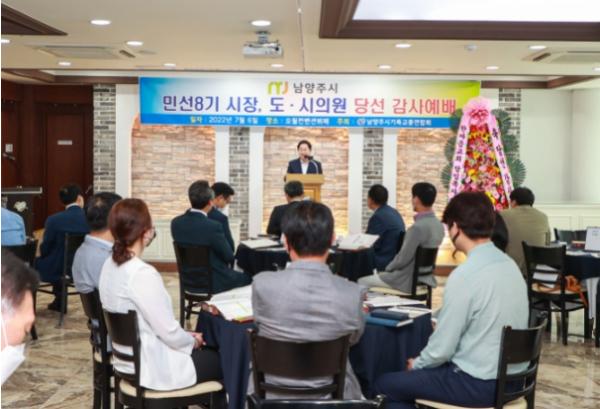 이번 감사예배는 제8회 전국동시지방선거에서 당선된 남양주시장 및 시·도의원의 취임을 축하함과 동시에 상호 소통하며 남양주시의 발전을 위한 의견을 나누고자 마련된 자리로, 1부 취임 감사예배와 설동욱 목사 설교, 2부 남기총 증경 총회장 축사 및 격려사와 당선인 인사, 3부 오찬 순서로 진행됐다.