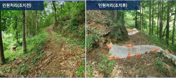가평상담소 장기원상담관은 민원이 빠르게 처리될 수 있도록 가평군 산림과에 전달하였으며 관련부서에서는 민원인 주택 상단 임야 공사부지 내 우수가 주택으로 흐르지 않도록 사면에 토사 배수로 설치작업을 완료하였고, 주택과 접한 사면 내 낙석을 방지할 수 있는 시설 등은 자력으로 조치하여야 할 사항임을 민원인에게 설명 했다.