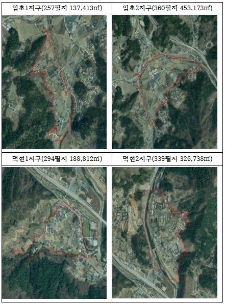 사업지구로 지정된 ‘임초1·2지구’ 사업 대상은 상면 임초리 220-4번지 일원으로 전체 617필지(59만 586㎡)이고, ‘덕현1·2지구’ 사업 대상은 상면 덕현리 364-2번지 일원으로 전체 633필지(51만 5,550㎡)이다.