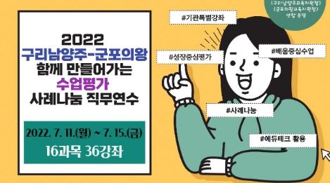 [한국뉴스타임=편집국] 경기도구리남양주교육지원청은 경기도군포의왕교육지원청과 연합하여 구리남양주와 군포의왕 지역의 희망 교사 대상으로 2022년 7월 11일(월)부터 7월 15일(금)까지 5일간 ‘2022 함께 만들어가는 수업평가 사례나눔 직무연수(16과목 36강좌)’를 실시한다.