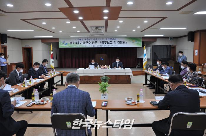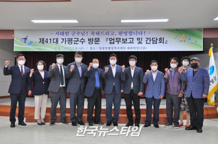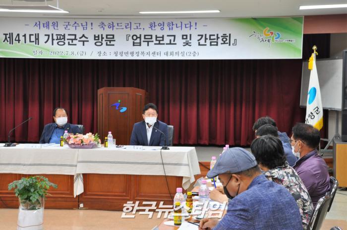 [한국뉴스타임=보도국] 8일 오전 서태원 가평군수는 청평면행정복지센터를 방문하여 업무보고를 받고 지역 단체장들과 간담회를 개최하였다.
