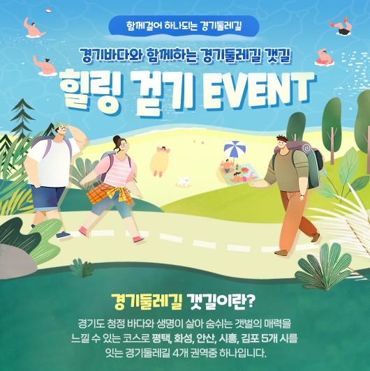 이벤트 참여 방법은 7월 9일부터 17일까지 가족, 친구 등 3인 이상이 함께 모여 경기바다를 따라 걷는 12개 힐링 코스 중 1개 이상을 방문 후 둘레길 상징물(안내판, 스탬프함 등) 인증사진을 찍고, 경기둘레길 누리집(gg.go.kr/dulegil)에 방문 후기 작성 및 참가신청서를 제출하면 된다. 참여자 중 선착순 200명에게는 등산용컵, 방수돗자리 등 경기둘레길 기념품을 지급한다.