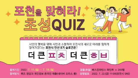 기간은 7월 11일부터 18일까지로, 참여방법은 시민의 행복을 위해 시민과 소통하며 포천시의 새로운 미래를 힘차게 열어가겠다는 포천시 민선8기 슬로건의 빈칸 초성을 네이버 폼에 입력하면 된다.