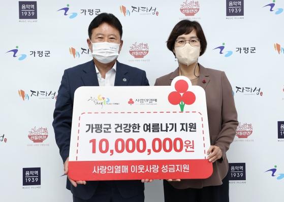 이번에 가평군에 지원되는 금액은 총 1,000만원으로 700만원은 하절기 저소득층 가정을 위한 냉방비 지원으로 가구당 10만원씩(총 70가구) 지원되며, 300만원은 가평군 사회복지시설에 어르신들을 위한 여름나기 용품 및 보양식으로 지원 될 예정이다.