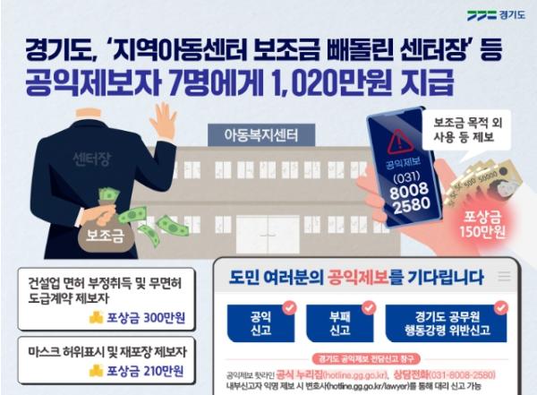[한국뉴스타임=편집국] 경기도가 급식비와 프로그램 운영비 등 지역아동센터 보조금 1,700여만 원을 빼돌린 센터장을 제보한 공익제보자에게 포상금 150만 원을 지급한다.