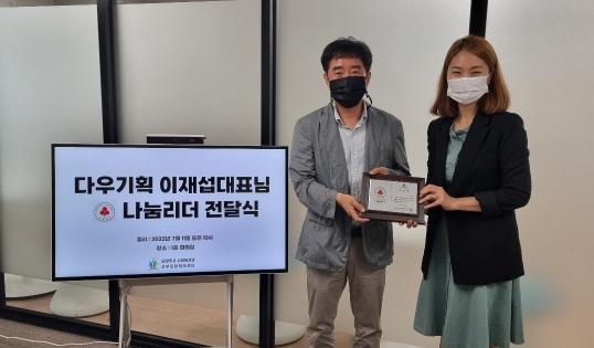 [한국뉴스타임=편집국] 남양주시 사회복지관 서부희망케어센터(센터장 신영미)는 지난 11일 다산동에 위치한 다우기획의 이재섭 대표에게 ‘나눔리더’ 인증패를 전달했다.