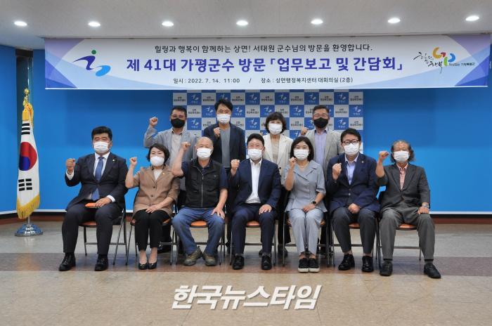 [한국뉴스타임=보도국] 14일 오전 서태원 가평군수는 지난주에 이어 세 번째로 상면행정복지센터를 방문하여 업무보고를 받고 지역 단체장들과 간담회를 개최하였다.