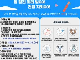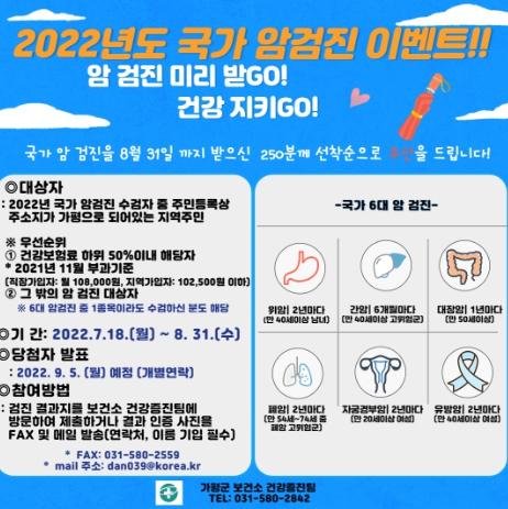 [한국뉴스타임=편집국] 가평군 보건소는 가평군 사망원인 1위인 암을 조기발견하고 치료를 유도함으로써 사망률을 줄이기 위해 2022년도 국가 암검진 수검 독려 이벤트인 ‘암 검진 받GO!, 건강 지키GO!를 실시한다.