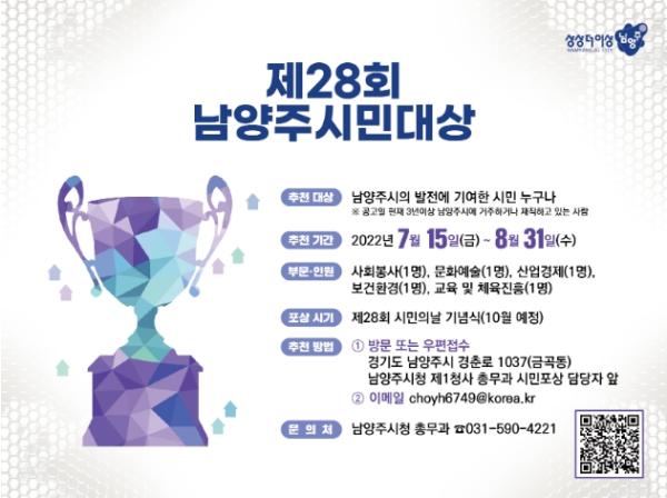 [한국뉴스타임=편집국] 남양주시는 다가오는 제28회 남양주 시민의 날을 맞이해 지역 곳곳에서 시의 위상을 높이고 시정발전에 공헌한 시민을 발굴하기 위해 오는 8월 31일까지 ‘남양주 시민대상’ 후보자를 추천받는다고 15일 밝혔다.
