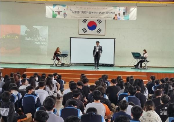 공연 시작에 앞서 동남고등학교 전교생이 대강당에 모여 공연 관람에 대한 준수사항과 사전교육을 실시하였다. 오전 반월오페라단의 공연은 장중한 클래식 연주로 시작하였고, 테너, 바리톤, 소프라노 성악가들의 노래로 더욱 분위기를 고조시켰다. 대중에 친숙한 곡들(그리운 금강산, 네순 도르마)이 연주되었을 때 학생들의 더욱 환호하고 뜨거운 반응을 보였다.