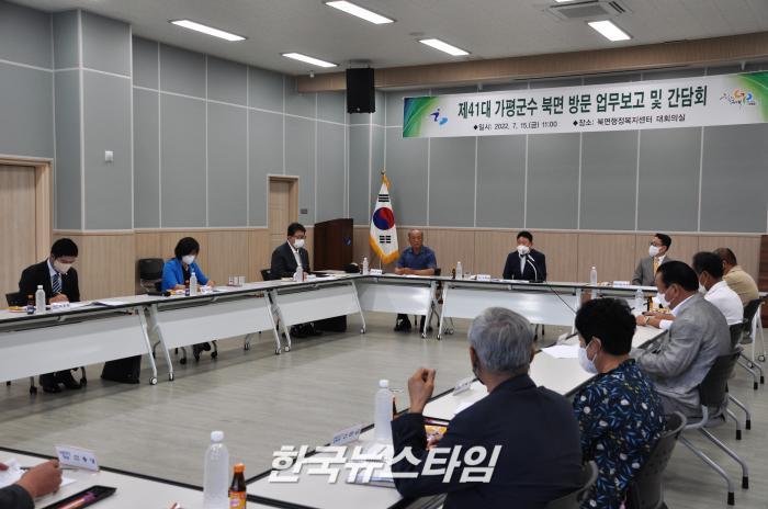 [한국뉴스타임=보도국] 15일 오전 서태원 가평군수는 북면행정복지센터를 방문하여 업무보고를 받고 지역 단체장들과 간담회를 가졌다.