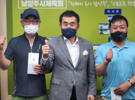 [한국뉴스타임=편집국] 남양주시체육회 김지환 회장은 지난 13일 경기도지사기에서 우수한 성적을 거둔 남양주시산악연맹 및 남양주시축구협회(50대 부)에 금일봉을 전달했다.
