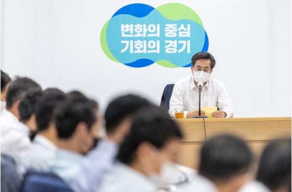 18일 모든 실국장과 공공기관 대표들이 참석한 가운데 열린 ‘7월 도정 열린회의’에서 김동연 지사는 ‘혁신’을 강조하며 최근 도에서 추진 중인 반려동물 테마파크와 관련된 사례를 소개했다.
