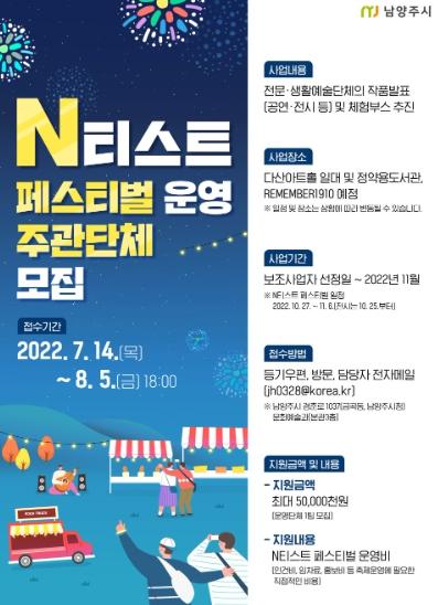 [한국뉴스타임=편집국] 남양주시는 ‘전문·생활 예술 활동 지원’ 사업에 선정된 33개 예술인 및 단체의 사업 결과를 공유하는 ‘N티스트 페스티벌’의 운영 주관 단체를 7월 14일부터 8월 5일까지 모집한다.