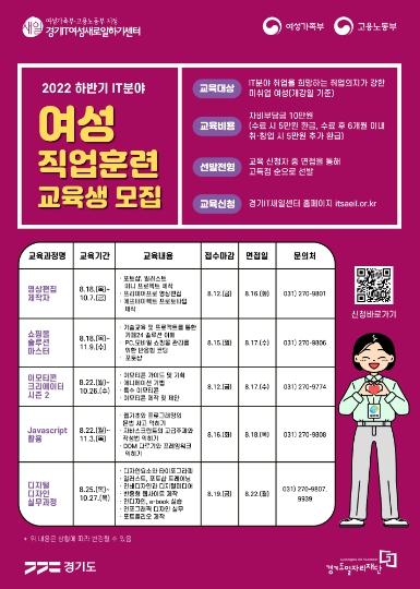 접수 마감일은 다음 달 12~19일로 과정별로 다르다. 자세한 사항은 경기IT새일센터 누리집을 확인하거나 여성새일1팀으로 문의하면 된다. 과정별 세부 교육내용 등은 다음 달 9일 ‘IT직업교육훈련 온라인 설명회’를 통해서도 확인 가능하다. 설명회 참여 사전신청자가 설명회 이후 만족도 설문 제출 시, 커피 쿠폰을 증정하는 이벤트도 열린다.