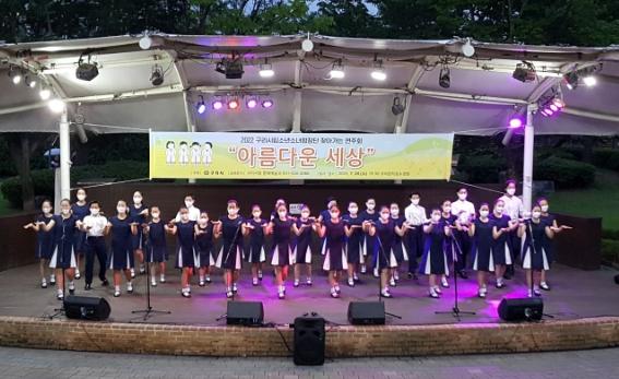 구리시립소년소녀합창단(지휘자 임명운)이 20일 장자호수공원 야외공연장에서 “아름다운 세상”이라는 주제로 찾아가는 연주회를 개최했다.