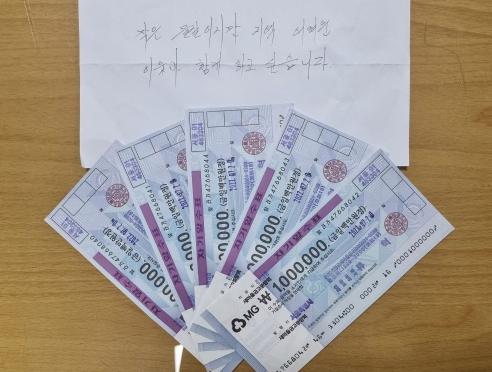 익명의 방문자가 건낸 봉투에는 “작은 물질이지만 지역 어려운 이웃과 함께 하고 싶습니다.” 라고 쓰여 진 편지와 일백만원권 수표 5장이 들어있었다. 청평면에는 익명의 독지가가 수년째 연 일천만원씩 성금이 이어지고 있는데 같은 독지가의 꾸준한 기탁으로 추정이 된다.